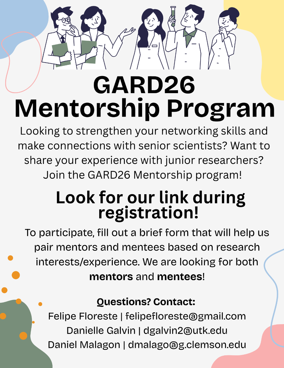 The mentorship programs pairs mentors (senior researchers) and mentees (junior researchers) based on shared research interests and career goals. Matches will be arranged before the conference, and our team will reach out to help facilitate your first contact. Our goal is to strengthen networking opportunities at the meeting by creating meaningful connections between senior and junior attendees throughout GARD26.