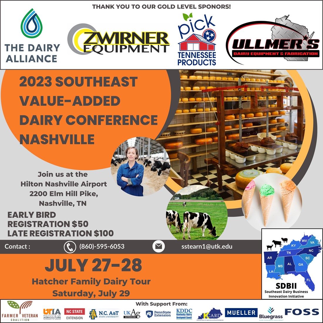 Conference Description: The fourth annual Southeast Value-Added Dairy Conference will be held in Nashville, Tennessee July 27-28. The event will bring individuals together from across the Southeast including dairy industry stakeholders, farmers, creamery managers, Extension professionals, dairy product buyers, and other members of the community. Keynote speakers will include UT alumni, and founders of Cowgirl Creamery, Sue Conley and Peggy Smith, and a welcome from TDA Commissioner Dr. Charlie Hatcher. The group will also have the opportunity to tour Hatcher Family Dairy on Saturday July 29.